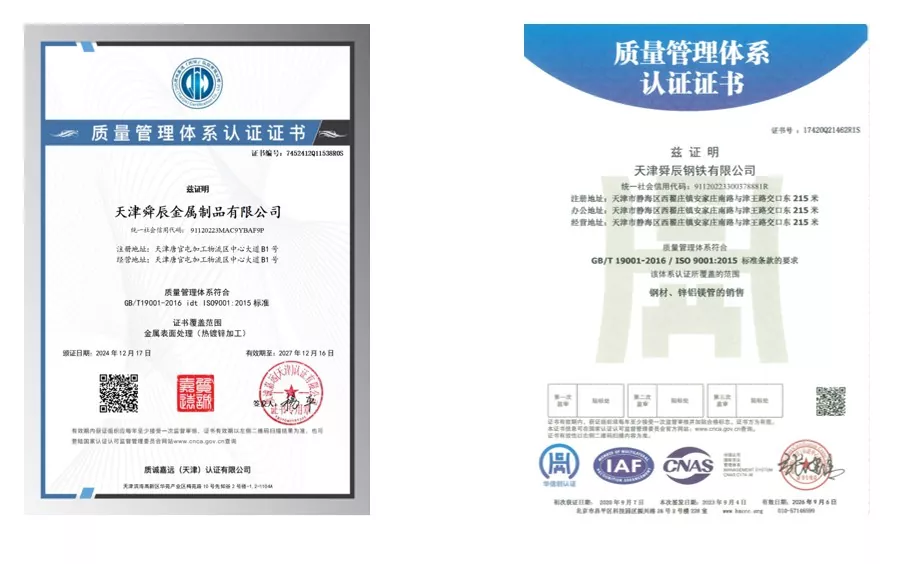 మమ్మల్ని ఎందుకు ఎంచుకోవాలి?టియాంజిన్ షున్చెంగ్ పరిశ్రమ సంవత్సరాల తరబడి సేకరించబడిన ఉత్పత్తి సాంకేతికతను కలిగి ఉంది, సున్నా డిఫాల్ట్లు మరియు జీరో వార్షిక నాణ్యత సంఘటనల యొక్క 12-సంవత్సరాల రికార్డును నిర్వహిస్తూ, ఉత్పత్తి నాణ్యతకు గట్టి పునాదిని వేస్తుంది. కంపెనీ జాతీయ ఉత్పత్తి ప్రమాణాలకు ఖచ్చితంగా కట్టుబడి ఉంటుంది మరియు ISO 9000, 3A సిస్టమ్ ధృవీకరణలు మరియు EU CE ధృవీకరణను కలిగి ఉంది. 12-దశల ప్రక్రియ మరియు 3-పొరల పూర్తి తనిఖీ యంత్రాంగంతో, ఇది ఏటా జీరో నాణ్యత మరియు భద్రతా సంఘటనలను సాధిస్తుంది మరియు 12 సంవత్సరాల పాటు జీరో ఆర్డర్ డిఫాల్ట్లను సాధిస్తుంది, దాని నిరూపితమైన బలాన్ని ప్రదర్శిస్తుంది. ప్రతి పూర్తయిన ఉత్పత్తి ప్యాకేజింగ్ మరియు షిప్పింగ్కు ముందు ఎండబెట్టడం, తనిఖీ చేయడం మరియు చక్కటి ముగింపుకు లోనవుతుంది, అత్యుత్తమ నాణ్యతను నిర్ధారిస్తుంది. కంపెనీ 300 మందికి పైగా ఉత్పత్తి కార్మికులను కలిగి ఉంది మరియు ERW స్టీల్ పైపుల యొక్క 236 స్పెసిఫికేషన్లను ఉత్పత్తి చేయగలదు, పూర్తి స్థాయి స్పెసిఫికేషన్లను అందిస్తోంది మరియు విభిన్న అవసరాలను ఖచ్చితంగా తీర్చడానికి అనుకూలీకరణకు మద్దతు ఇస్తుంది.
