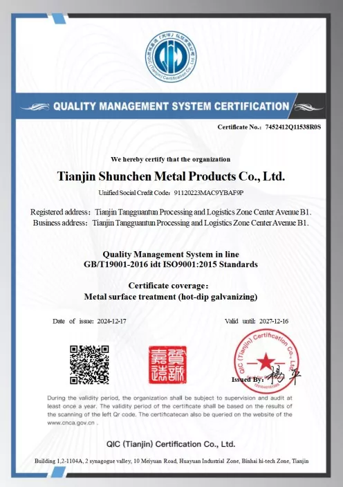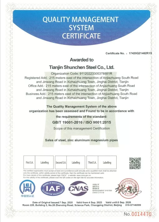 ప్రమాణాలు: GB/T 3091-2015 "తక్కువ పీడన ద్రవ రవాణా కోసం వెల్డెడ్ స్టీల్ పైప్స్", GB/T 13912-2020 "హాట్-డిప్ గాల్వనైజ్డ్ స్టీల్ ట్యూబ్స్". ఉత్పత్తి మూడవ పక్షం పరీక్షలో ఉత్తీర్ణత సాధించింది మరియు పరీక్ష నివేదికను కలిగి ఉంది.