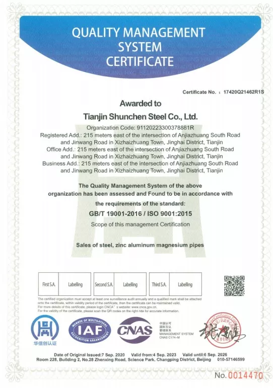 టియాంజిన్ షుంచెన్ ఇండస్ట్రియల్ కంపెనీ ఉక్కు పరిశ్రమలో మూడు దశాబ్దాల ఉత్పత్తి అనుభవాన్ని పొందింది. కంపెనీ ISO 9000, 3A సిస్టమ్ ధృవీకరణలను కలిగి ఉంది, అలాగే యూరోపియన్ యూనియన్ యొక్క CE ధృవీకరణను కలిగి ఉంది మరియు గాల్వనైజింగ్ ప్రాసెసింగ్ నుండి అమ్మకాలు మరియు పంపిణీ వరకు పూర్తి పారిశ్రామిక గొలుసు లేఅవుట్ను ఏర్పాటు చేసింది. కఠినమైన 12-దశల ప్రక్రియ ప్రవాహాలు మరియు మూడు-స్థాయి సమగ్ర తనిఖీ యంత్రాంగం ద్వారా, కంపెనీ వరుసగా 12 సంవత్సరాలుగా జీరో వార్షిక నాణ్యత మరియు భద్రతా ప్రమాదాలు మరియు జీరో ఆర్డర్ డిఫాల్ట్ల రికార్డును సాధించింది. షుంచెన్ ఇండస్ట్రియల్ ఏడాది పొడవునా గాల్వనైజ్డ్ స్టీల్ స్పాట్ ఇన్వెంటరీని 20,000 టన్నులకు పైగా నిర్వహిస్తుంది, ఇది గిడ్డంగి మరియు పంపిణీని ఏకీకృతం చేసే పెద్ద-స్థాయి గాల్వనైజ్డ్ స్టీల్ సూపర్మార్కెట్ను ఏర్పరుస్తుంది. గిడ్డంగి 10,000 చదరపు మీటర్ల విస్తీర్ణంలో ఉంది, సమీకృత ఉత్పత్తి మరియు అమ్మకాల సేవకు ఘనమైన మద్దతును అందిస్తుంది.