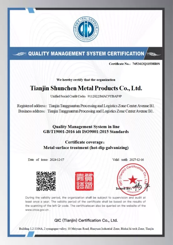 విశ్వసనీయ నాణ్యత కోసం షున్చెన్ని ఎంచుకోండి. మేము తుప్పు నిరోధకత కోసం హాట్-డిప్ గాల్వనైజింగ్ ద్వారా ప్రాసెస్ చేయబడిన Q235B లేదా Q355B యొక్క అధిక-నాణ్యత ఉక్కును ఉపయోగిస్తాము. జింక్ కుండ యొక్క ఉష్ణోగ్రత ఖచ్చితంగా 450-460 డిగ్రీల సెల్సియస్ పరిధిలో నియంత్రించబడుతుంది, ఇది జింక్ పూత యొక్క బలమైన సంశ్లేషణ మరియు తప్పిపోయిన ప్రాంతాలను నిర్ధారించడానికి. మా ఉత్పత్తులు ISO9001 నాణ్యత సిస్టమ్ ధృవీకరణకు అనుగుణంగా ఉంటాయి మరియు థర్డ్-పార్టీ జింక్ కోటింగ్ తనిఖీ నివేదికల ద్వారా మద్దతునిస్తాయి.